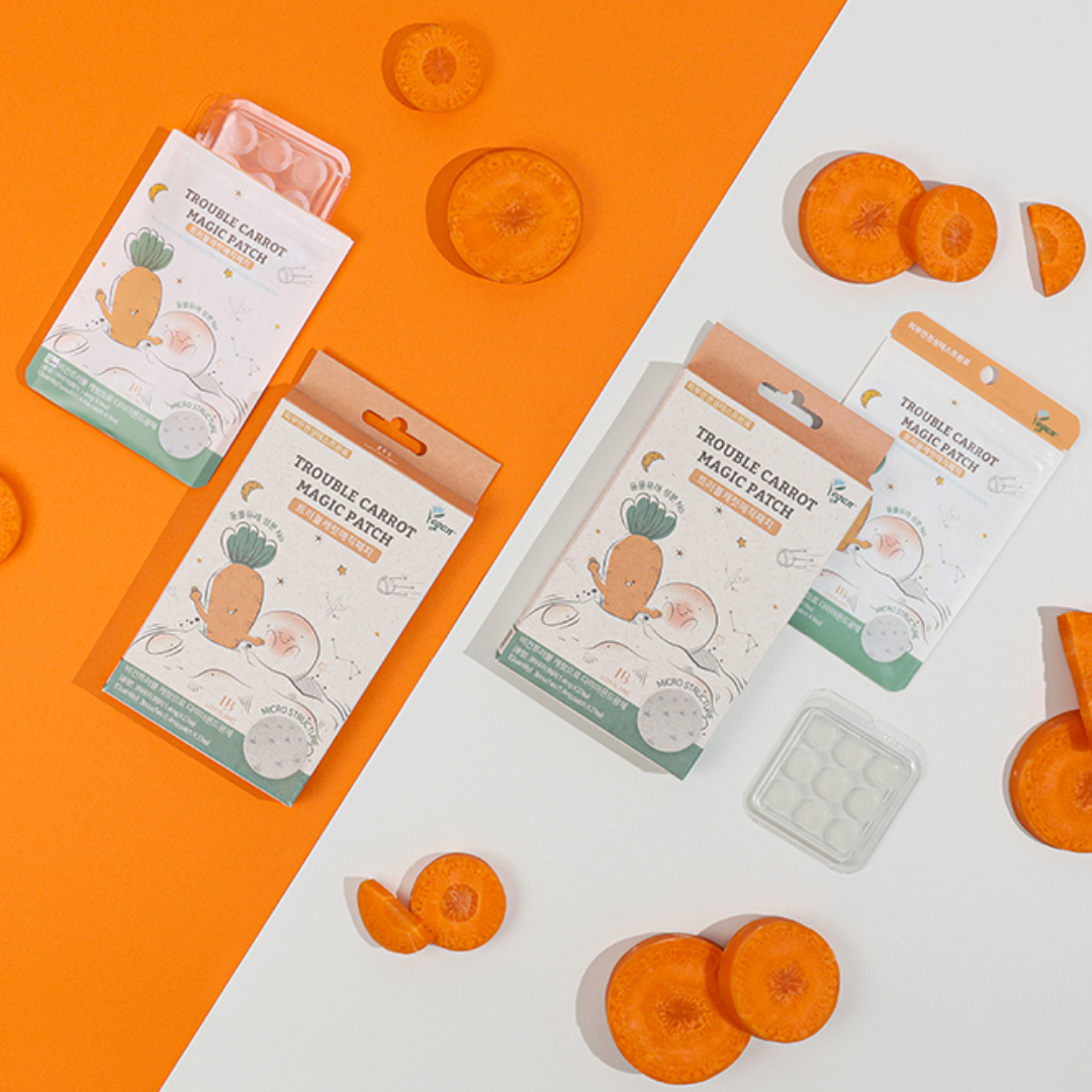 Akne-Patches mit Karottenextrakt, die gezielt Pickel abdecken, beruhigen und das Hautbild klären.